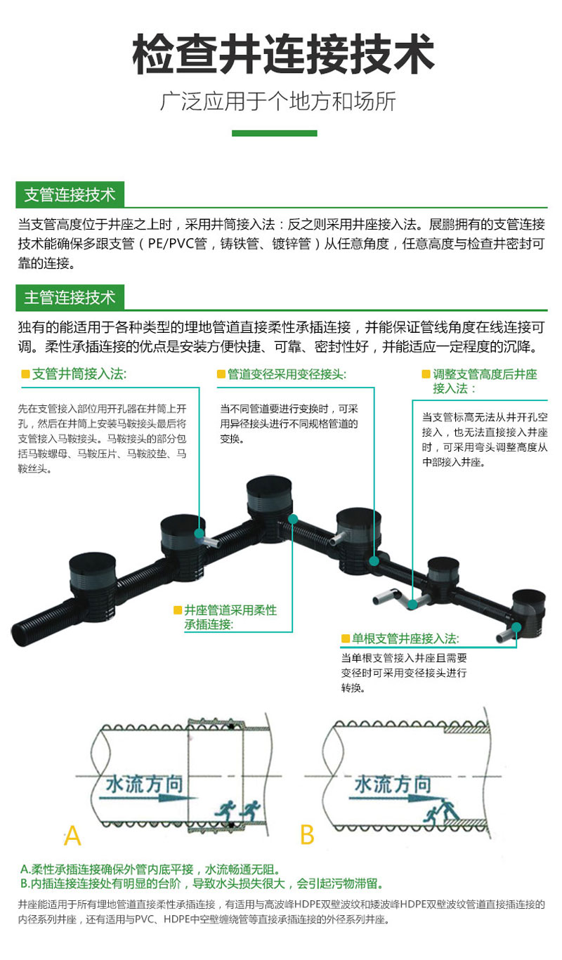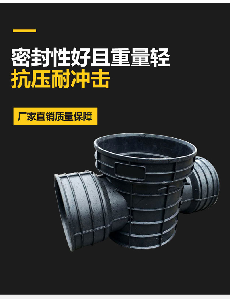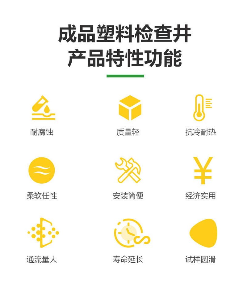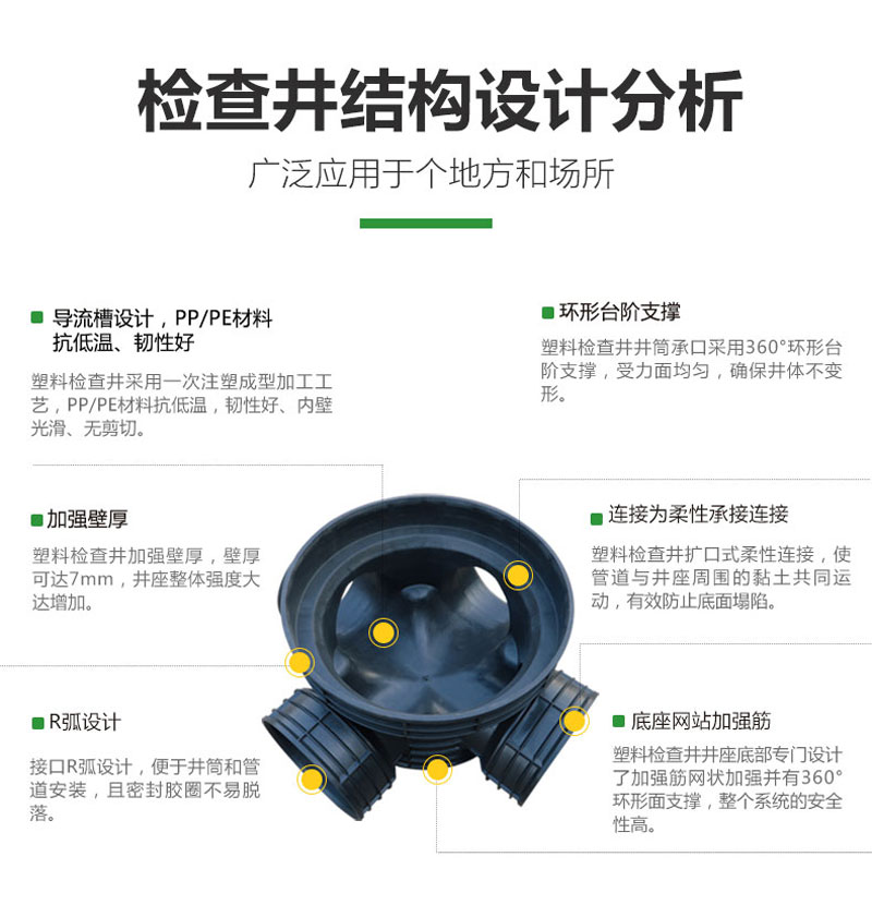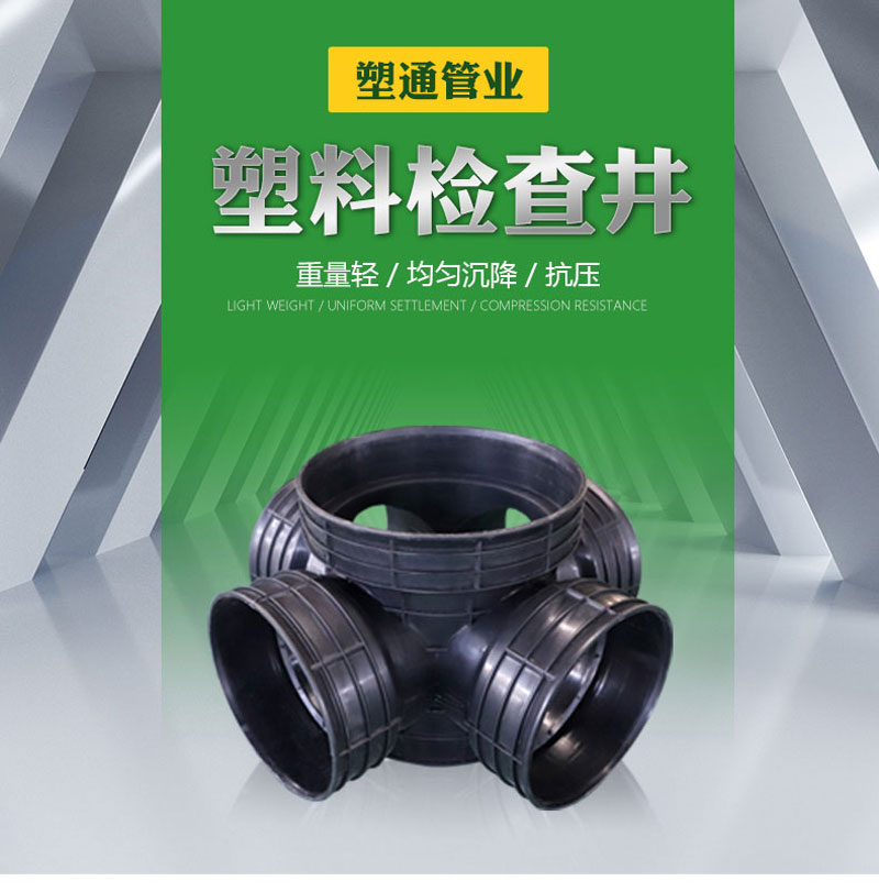 起始塑料检查井的材料是高密度聚乙烯塑料,安全环保耐酸碱腐蚀耐老化、使用寿命长。使用后可回收利用。属于化学环保建材,符合国家环境保护的大政方针。均匀沉降、抗压。管道与井座柔性连接,管道与井座的粘土共同运动、解决了传统检查井与塑料管道连接所产生的不均匀沉降问题,有效防止地面塌陷、