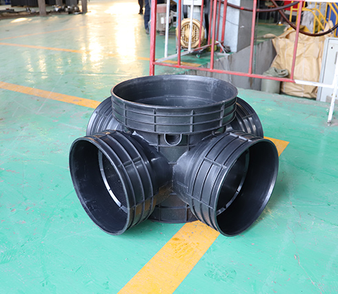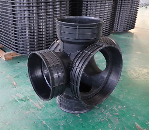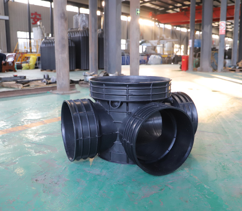 四通检查井的材料是高密度聚乙烯塑料,安全环保耐酸碱腐蚀耐老化、使用寿命长。使用后可回收利用。属于化学环保建材,符合国家环境保护的大政方针。均匀沉降、抗压。管道与井座柔性连接,管道与井座的粘土共同运动、解决了传统检查井与塑料管道连接所产生的不均匀沉降问题,有效防止地面塌陷。